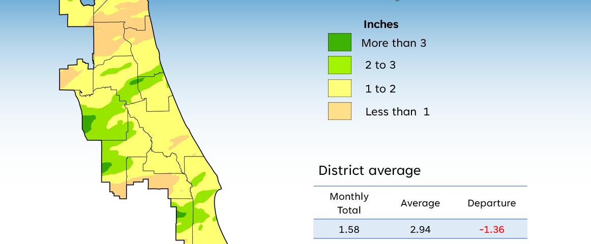 - Districtwide rainfall averaged 1.58 inches, 1.36 inches below the monthly average.