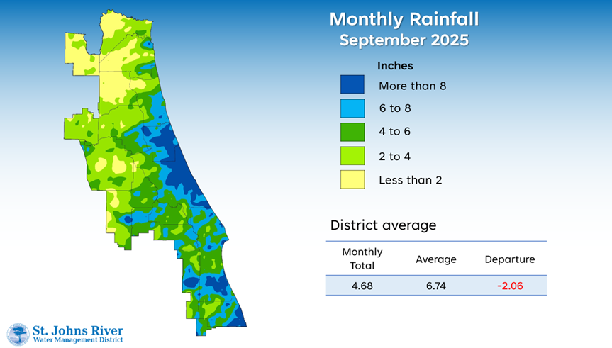 September brought highly varied rainfall totals across the St. Johns River Water Management District, with greater differences than typically expected for this time of year. While portions of the central and southern coastal areas received more than 10 inches of rain, particularly in Volusia and Flagler counties, areas to the west and northwest saw considerably less precipitation.