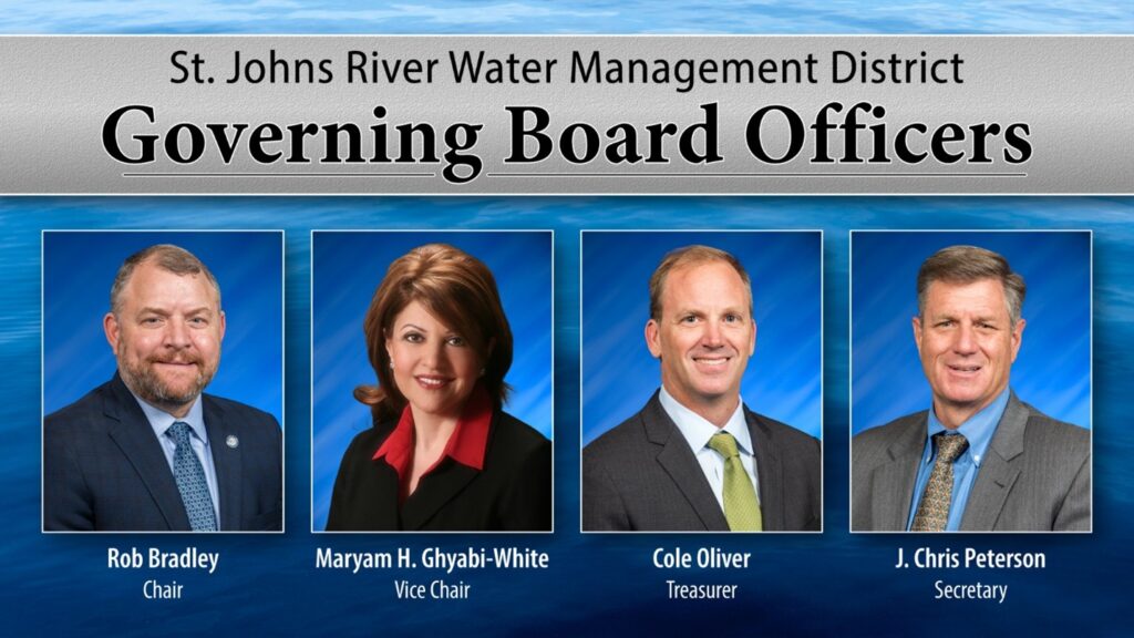 The District’s Governing Board re-elected Sen. Rob Bradley of Fleming Island to serve as its chair for a fifth consecutive year. The Board also re-elected Maryam Ghyabi-White of Ormond Beach to serve as vice chair; Cole Oliver of Merritt Island as treasurer; and J. Chris Peterson of Winter Park as secretary.