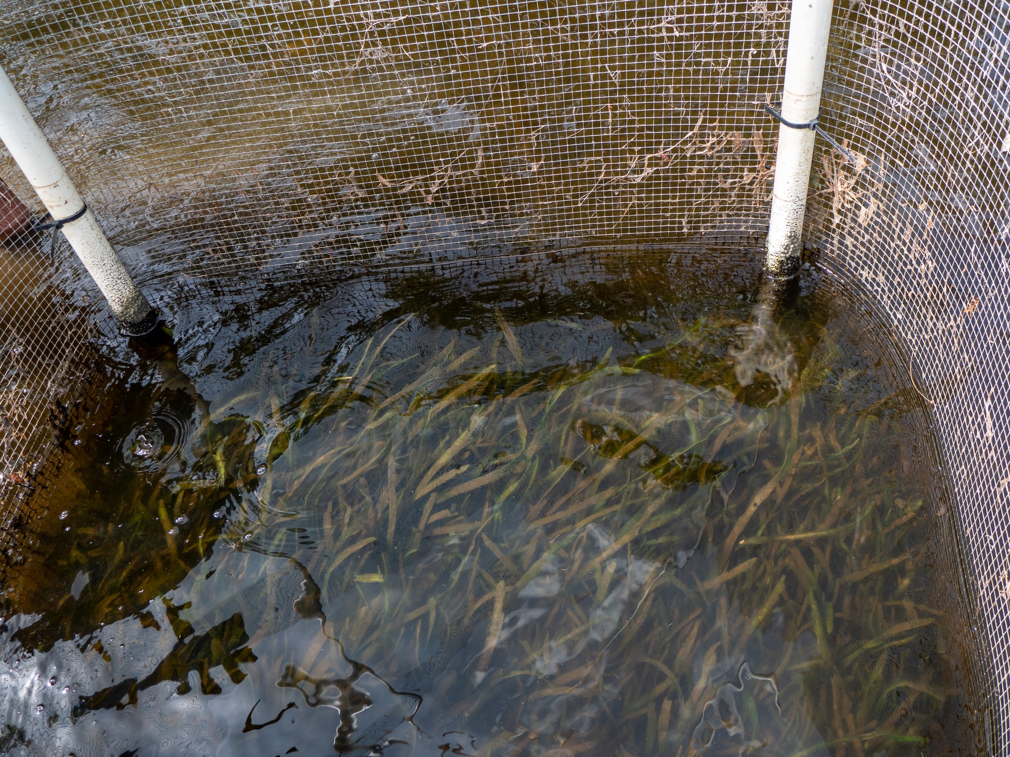 District researchers, in partnership with FWC, have further studied how herbivory affects plant recovery. These exclusion experiments and transplant projects show a clear difference: outside cages, grasses are kept short by constant grazing from turtles, fish and manatees, while inside the barriers the plants are able to grow to full height. These findings highlight the extent to which grazing pressure influences SAV growth and canopy development.