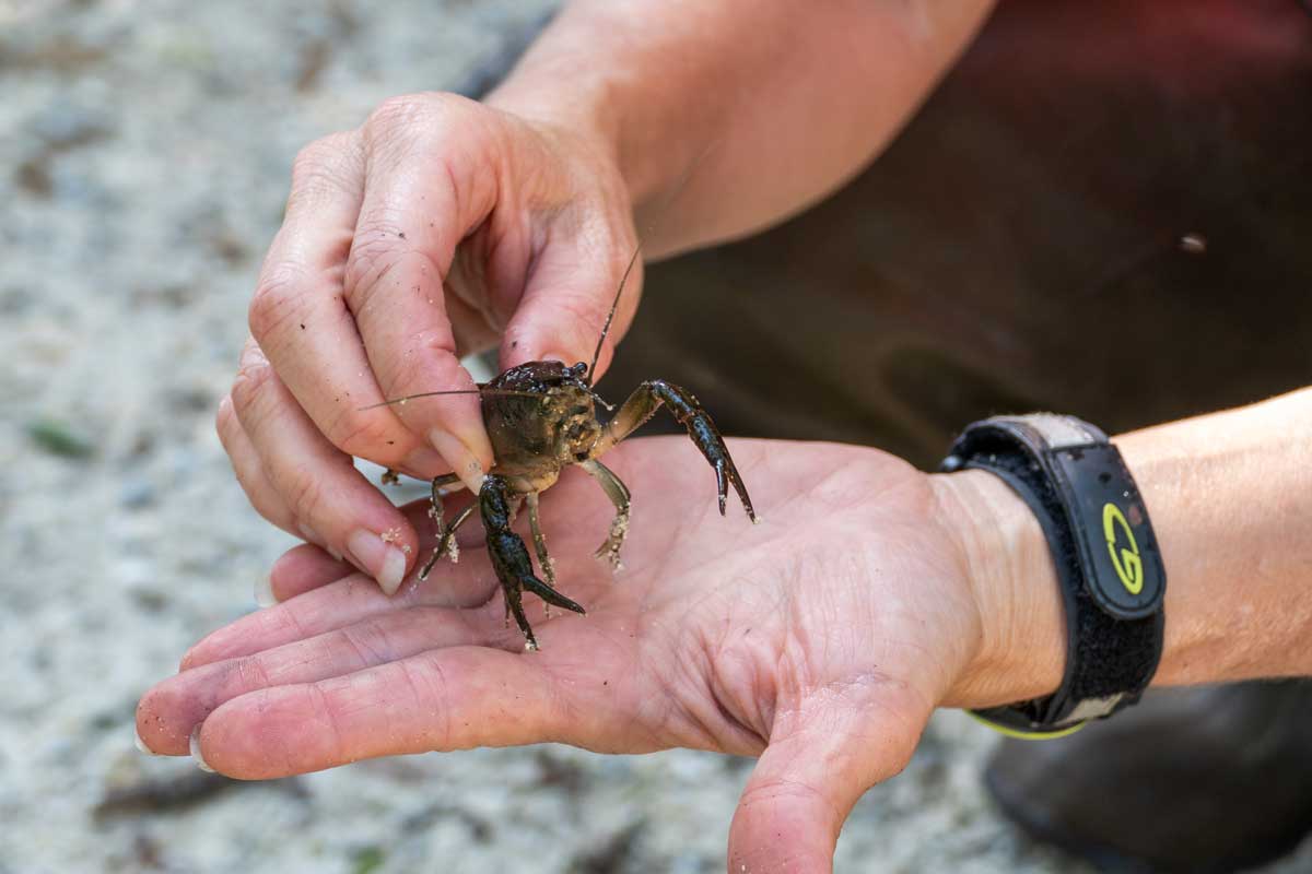 The search is on. Olson, the property’s land manager, finds an ornery crayfish in a trap submerged in the swamp. Emanuel, meanwhile identifies a spotted sunfish…or is it a pirate perch? His other catch: a black water beetle about the size of a cigar.