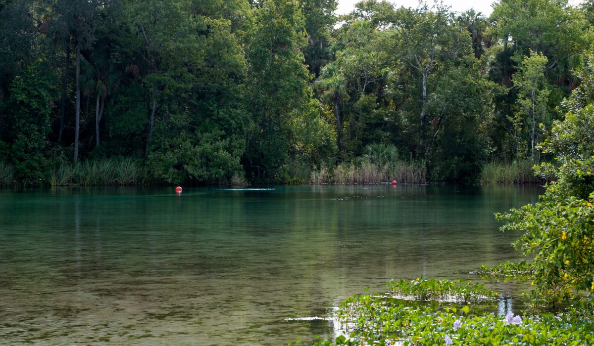 A designated Outstanding Florida Spring, De Leon Springs is a second-magnitude spring with a semicircular pool about 190 feet from north to south and 170 feet from east to west. Spring flow is from a cavern and chimney opening in the north-central part of the pool. A low boil is visible at the surface above the opening in the limestone rock. The pool is enclosed by a low concrete wall and bordered by a concrete walk. A large bathhouse and snack bar are on the north side of the pool. The spring water flows through a concrete weir on the west wall of the pool, then down a 3-foot drop into a wide spring run. The broad but short run carries flow westward through a chain of three lakes (Spring Garden, Woodruff, and Dexter), then to the St. Johns River.